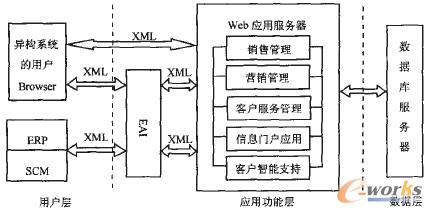 包括ERP、SCM等其他企業(yè)應(yīng)用在內(nèi)的所有的系統(tǒng)用戶與應(yīng)用功能層的數(shù)據(jù)交換均通過XMI數(shù)據(jù)進行傳輸,從而大大減小了各種企業(yè)應(yīng)用系統(tǒng)間的通信阻力,為EAI提供了良好的通信平臺。Web用戶的客戶端只是“瘦小的”瀏覽器日_數(shù)量不受限制,不需要安裝專門的軟件,這使得凡可以接入Internet的用戶都可以方便、靈活地使用系統(tǒng),大大提升了系統(tǒng)用戶間溝通、協(xié)作的效率。此外,由于CRM應(yīng)用系統(tǒng)是在中央服務(wù)器上實施和維護的,對客戶端的要求遠沒有C/S結(jié)構(gòu)那么高,集中的軟件實施和維護大大節(jié)約了企業(yè)的運行成本和維護費用。圖1描述的是筆者所要闡述的適應(yīng)網(wǎng)絡(luò)環(huán)境的基于Web的系統(tǒng)平臺架構(gòu),這并不意味著CRM應(yīng)用系統(tǒng)完全以這種方式運行,事實上用戶接入CRM系統(tǒng)的方式是多種多樣的,系統(tǒng)還應(yīng)該提供電話、傳真、無線接入等多種接入接口。