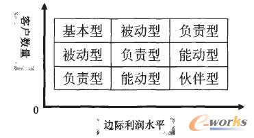 這5種類型之間并不具有簡單的優(yōu)劣對比或順序,因為企業(yè)所采用的客戶關(guān)系類型取決它的產(chǎn)品以及客戶的特征,不同企業(yè)甚至同一企業(yè)在對待不同客戶時,都有可能采用不同的客戶類型。一家生產(chǎn)日用化妝品的企業(yè),與它的化妝品消費者個人之間常會建立一種被動型的客戶關(guān)系,企業(yè)設(shè)立的客戶服務(wù)機構(gòu)或聯(lián)絡(luò)中心將聽取客戶的意見,處理客戶投訴以及改進產(chǎn)品;但這家企業(yè)同大型超市或零售企業(yè),同連鎖的美容產(chǎn)業(yè)機構(gòu)之間,?赡芙⒁环N伙伴型的客戶關(guān)系,實現(xiàn)產(chǎn)銷企業(yè)之間的互惠互利?铺乩仗岢,企業(yè)可以根據(jù)其客戶的數(shù)量以及產(chǎn)品的邊際利潤水平,根據(jù)圖3指示的思路,選擇合適的客戶關(guān)系類型。