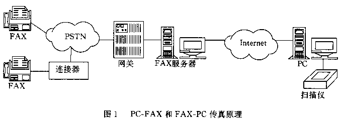 傳真機的基本工作原理是利用光電掃描技術將圖像、文字轉化為采用霍夫曼編碼方式的數(shù)字信號,經V.27、V.29方式調制后,按T.30協(xié)議在模擬信道上傳輸。由于通信協(xié)議、信號格式的不同,傳真機是不能直接在Internet網上傳送信息的。要使連接在PSTN上的傳真機發(fā)出的信號在Internet網上傳輸,基本的原理則是在PSTN和Internet之間構筑網關,由網關進行協(xié)議的轉換,使PSTN網的傳真信號和Internet網的數(shù)據(jù)包可以相互轉換。