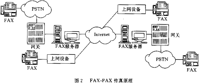 發(fā)送端傳真機與網關連接,通過PSTN傳送傳真,網關接收傳真后通過Internet傳至另一端的網關,另一端的網關再通過PSTN將傳真發(fā)送給接收端傳真機。這種方式既適合存儲轉發(fā)模式,也適合實時模式,因此更加有吸引力。近年來,出現(xiàn)了一種不依賴網關的FAX-FAX IP傳真技術,它是利用傳真機外掛一專用上網設備直接在Internet網上發(fā)送信息,原理如圖2所示。