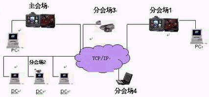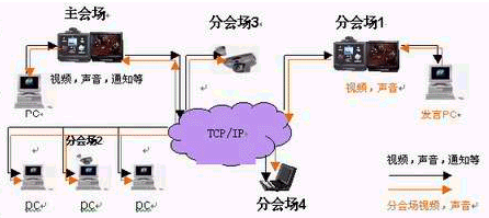 可視化Ip電話會議系統(tǒng): 是利用計算機,多媒體通信技術和設備,通過傳輸信道在兩地或多個地點之間開會的一種通信手段。在召開會議時,處于兩地或不同地點的與會代表,既可以聽到對方的聲音,又可以看到對方的形象,同時還能看到對方會議室的場景,以及在會議中展示的事物、圖片、表格、文件等,縮短了與會代表的距離,使大家好像在同一會議室參加會議一樣。它的廣泛應用必然產(chǎn)生巨大的社會效益和經(jīng)濟效益。系統(tǒng)結(jié)構(gòu)簡圖如下: