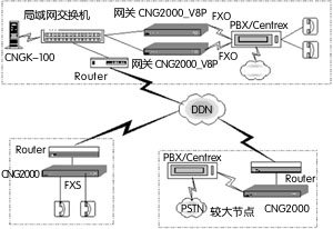 用這種方式組建IP語音系統(tǒng),各節(jié)點(diǎn)可根據(jù)接入的用戶數(shù)及通信話務(wù)量大小,靈活匹配一臺或多臺CNG-2000 IP接入網(wǎng)關(guān)。實(shí)際撥打時(shí)只需撥打配置好的號碼,撥號方式簡單。
