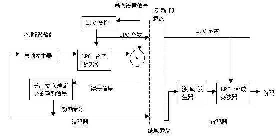 為了說明問題,考慮人的聲道產生的一個語音模式:當人說話產生語音信號時就會發(fā)出濁音(如音素pa、da等)和清音(如音素sh、th)。激勵信號就是由輸入的語音信號導出的,其方法是使合成語音與輸入語音的差別非常小。LPC的用法、激勵的產生以及對合成分析(AbS)系統(tǒng)的誤差檢查均如圖4-1所示。