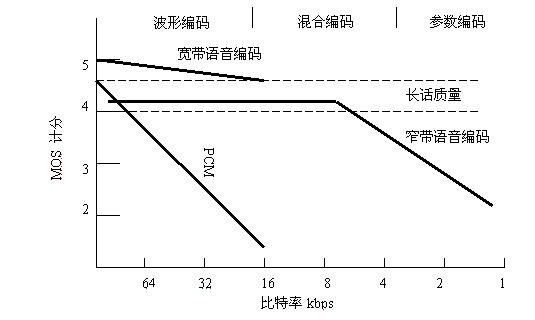 長話質量編碼器在比特率高于8Kbps時容易實現(xiàn),如圖4-2所示。長話質量的語音平均意見得分(MOS)必須在分或許分以上。傳統(tǒng)的PCN語音在比特率小于32