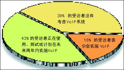 該調(diào)查收集了全球254名高級管理人員對未來企業(yè)網(wǎng)絡(luò)的意見和看法。其中,43%的受訪者表示,他們正在使用、測試或計(jì)劃在未來兩年內(nèi)實(shí)施VoIP;另外 18% 的受訪者表示,從長遠(yuǎn)的角度來講,他們會實(shí)施 VoIP。市場預(yù)測也顯示相同的樂觀前景。研究機(jī)構(gòu)Gartner Dataquest預(yù)期到2008年,公用電話交換網(wǎng) (PSTN) 的零售語音收入將輕微下跌,而VoIP的零售收入則上升 38.6%。
