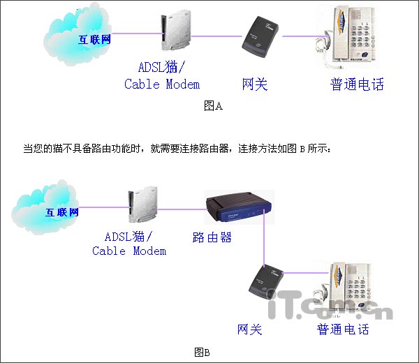網(wǎng)關(guān)聯(lián)接至RJ45網(wǎng)線,普通電話機(jī)聯(lián)接在PHONE端口,該網(wǎng)關(guān)可通過市話線路或網(wǎng)絡(luò)撥打電話,原有市話線聯(lián)接在PSTN口上,直撥號碼時(shí)為通過網(wǎng)絡(luò)撥打,加前置碼#0*通過原有市話線撥打,如停電,所有電話均自動(dòng)從原有市話線路撥出。
