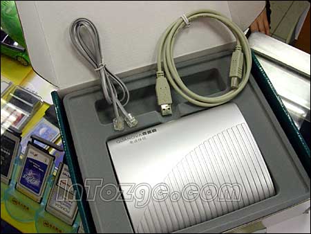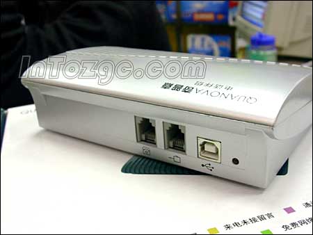 于是俺馬上來(lái)到商家朋友的柜臺(tái),準(zhǔn)備看看究竟是何方“神圣”,能有如此的本事?老板笑呵呵的將產(chǎn)品包裝打開(kāi),從里面拿出了一個(gè)銀色的盒子,全塑外殼,材質(zhì)還算不錯(cuò)。個(gè)頭倒也不小,表面積和一個(gè)普通的鼠標(biāo)墊差不多,流線型機(jī)身,這款產(chǎn)品外表設(shè)計(jì)非常簡(jiǎn)單,僅在后部設(shè)有兩個(gè)電話線專(zhuān)用的RJ11口和一個(gè)USB接口,其它就沒(méi)有什么特殊的地方了。