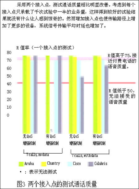 但我們這樣做是合理的。首先,Chantry和Colubris的設(shè)備甚至在建議內(nèi)的6個并行VoIP呼叫情況下,也無法正常通話。第二,Aruba的設(shè)備能夠處理7個并行VoIP呼叫并能適應(yīng)加入數(shù)據(jù)流業(yè)務(wù)的情況。第三,我們最有難度的試驗也遠低于無線傳輸媒介的最大負(fù)載。我們試驗通常低于3Mbps的通信傳輸速度(包括試驗中的所有語音和數(shù)據(jù)業(yè)務(wù)),更遠低于無線信道的容量了?傊,VoWLAN系統(tǒng)可以實現(xiàn)在單接入點承載7個并行VoIP呼叫并加入數(shù)據(jù)通信業(yè)務(wù),但要做到這一點需要更完善的系統(tǒng)設(shè)計和產(chǎn)品性能。