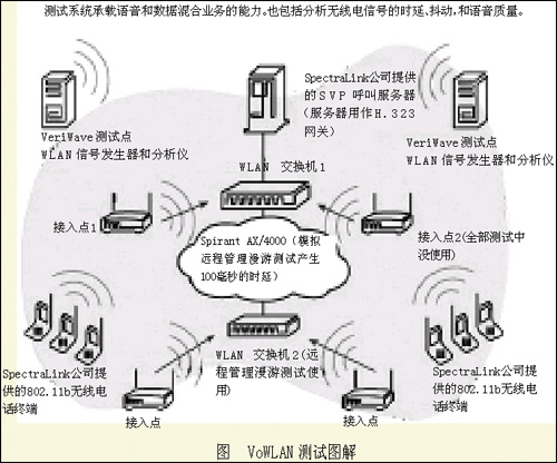 這次試驗搭建了有著自己鮮明特點的VoWLAN試驗系統(tǒng)。該系統(tǒng)包括兩個802.11b接入點適配設(shè)備和一部連接到接入點的交換機以及路由設(shè)備,還有14個WLAN手持終端設(shè)備和SpectraLink公司提供的SVP呼叫服務(wù)器(服務(wù)器用做H.323網(wǎng)關(guān))。另外,VeriWave公司提供了實驗的測試設(shè)備。我們還在漫游測試項目中使用了由Spirent公司提供的信號損傷發(fā)生器。