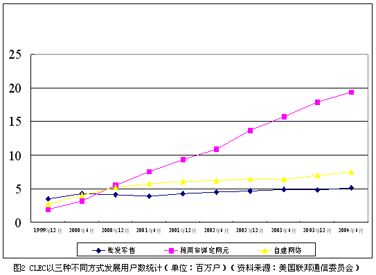 從經(jīng)營(yíng)模式上看,本地非主導(dǎo)運(yùn)營(yíng)商的商業(yè)模式在過(guò)去的5年中發(fā)生了很大變化。在市場(chǎng)剛剛開始引入競(jìng)爭(zhēng)的1999年,42.9%的本地非主導(dǎo)運(yùn)營(yíng)商選擇了批發(fā)零售這種進(jìn)入門檻相對(duì)較低的商業(yè)模式,本地電話市場(chǎng)一度活躍著大量地區(qū)性的小運(yùn)營(yíng)商。由于面臨本地主導(dǎo)運(yùn)營(yíng)商的強(qiáng)烈抵制,非綁定網(wǎng)元政策的實(shí)施自公布以來(lái)一再推遲,經(jīng)過(guò)反復(fù)的法律訴訟,美國(guó)最高法院在2002年最終裁定非綁定網(wǎng)元政策合法。自那時(shí)起,AT&T、MCI等全國(guó)性的長(zhǎng)途電話運(yùn)營(yíng)商紛紛通過(guò)租用非綁定網(wǎng)元的方式進(jìn)入本地電話市場(chǎng)。截止到2004年6月,本地主導(dǎo)運(yùn)營(yíng)商已經(jīng)提供了約2150萬(wàn)線非綁定本地用戶線給本地非主導(dǎo)運(yùn)營(yíng)商。CLEC以三種方式發(fā)展用戶的情況如圖2所示。