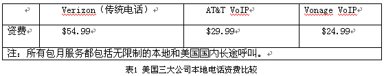 隨著寬帶接入的進(jìn)一步普及,VoIP似乎為打破本地環(huán)路的瓶頸提供了新的選擇,AT&T、Qwest、時(shí)代華納、Verizon等老牌運(yùn)營(yíng)商紛紛開始提供這項(xiàng)服務(wù)。AT&T于2004年3月在新澤西州和德克薩斯州推出了29.99美元的包月計(jì)劃,其VoIP業(yè)務(wù)不僅包含了基本語(yǔ)音服務(wù),也提供諸如呼叫轉(zhuǎn)移、會(huì)議電話、來(lái)電顯示等增值服務(wù),美國(guó)三大公司本地電話資費(fèi)如表1所示。
