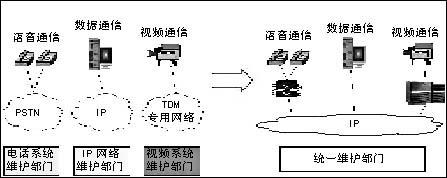 通過IP化改造,原來分別管理IP網(wǎng)絡(luò)和電話網(wǎng)絡(luò)的兩個部門可以有效整合,有助于簡化機構(gòu)設(shè)置和工作流程,實現(xiàn)對行業(yè)通信系統(tǒng)的統(tǒng)一管理,提高行業(yè)科技部門的工作效率(見圖1)。