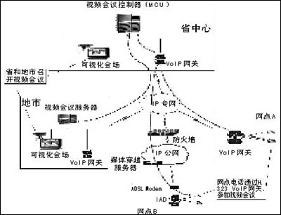 通過在全省部署VoIP系統(tǒng),網(wǎng)點VoIP網(wǎng)關(guān)可以通過H.245協(xié)議與視頻會議MCU(多點控制器)進行通信能力的動態(tài)協(xié)商,在國家、省和地市召開視頻會議時,網(wǎng)點可以通過普通電話(或者電話會議終端)參與會議,實現(xiàn)“聽聲參會”,低成本地實現(xiàn)了行業(yè)視頻會議系統(tǒng)的延伸。