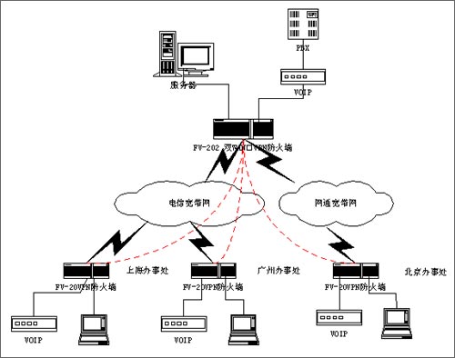 VPN防火墻網(wǎng)關(guān)具有雙WAN口和QOS帶寬管理功能,總部同時接入兩條ADSL線路,通過策略路由,把內(nèi)部網(wǎng)絡(luò)的上網(wǎng)訪問全部從WAN2的ADSL上網(wǎng),而把VOIP和VPN全部通過WAN1的ADSL來傳輸,從而避免了上網(wǎng)的請求占用VPN和VOIP的帶寬。同時,通過對內(nèi)部網(wǎng)絡(luò)不同的業(yè)務(wù)劃分不同的優(yōu)先級,特別是把VOIP的優(yōu)先級做為最高,優(yōu)先轉(zhuǎn)發(fā)VOIP的數(shù)據(jù)包,同時又通過VOIP和VPN傳輸分配最大和最小的保證帶寬,來保護(hù)VOIP業(yè)務(wù)的正常通信。除此之外,F(xiàn)V-202強大的訪問控制功能,特別是對VPN隧道的訪問控制功能,可以對各地的分公司通過VPN訪問總公司的服務(wù)器進(jìn)行控制,為不同的客戶分配不同的權(quán)限,讓遠(yuǎn)程的VPN隧道只能訪問指定的IP地址或相關(guān)的業(yè)務(wù)端口,能很好保證VPN的訪問安全。特別值得一提的是,F(xiàn)V-202支持網(wǎng)通、電信雙線路接入,如果由于北方網(wǎng)通跨網(wǎng)接入,可以在全部申請網(wǎng)通線路,把北方的分支機構(gòu)接入到總部的網(wǎng)通線路,可以避免由于跨網(wǎng)帶來的帶寬瓶頸。在各個分支機構(gòu)配置iRouter的FV-20VPN防火墻,為各個分支機構(gòu)構(gòu)建一道安全的防線,實現(xiàn)與總部的VPN的聯(lián)接。同時,外出的員工或領(lǐng)導(dǎo)通過IPSEC的撥號軟件,實現(xiàn)移動的接入,通過VPN,東莞奧愛斯構(gòu)建全國的融合的安全通信平臺,既可以解決VOIP的被竊聽的風(fēng)險,又能實現(xiàn)實時的數(shù)據(jù)訪問。從而大大地降低公司長途的話費和以往租用數(shù)據(jù)專線的高昂的費用,提高了公司的工作效率,為公司帶來十分明顯的經(jīng)濟(jì)效益。