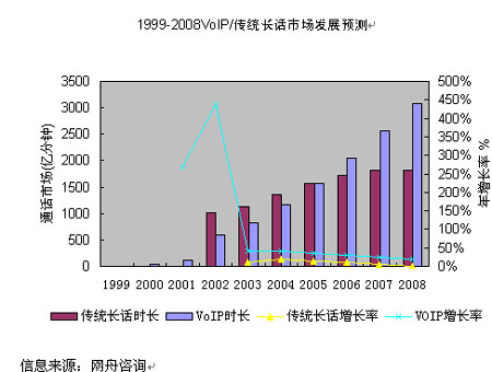 2000年以來(lái),IP長(zhǎng)話憑借明顯的資費(fèi)優(yōu)勢(shì),對(duì)傳統(tǒng)長(zhǎng)話形成了有力的競(jìng)爭(zhēng),在通話量上已趕超了傳統(tǒng)長(zhǎng)話。也正是由于IP長(zhǎng)話的低資費(fèi),在其通話量大幅度增加的同時(shí),也導(dǎo)致了國(guó)內(nèi)長(zhǎng)話網(wǎng)總體收入的下降,長(zhǎng)途電話IP化的趨勢(shì)十分明顯?傮w而言,中國(guó)VoIP市場(chǎng)仍蘊(yùn)藏著非常大的潛力,按照3G和NGN的部署速度,