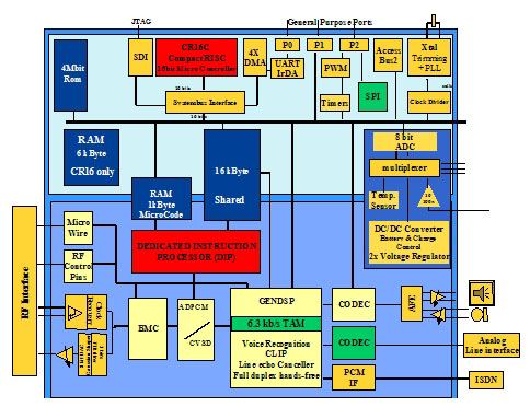 例如,SC14438是一個優(yōu)化了的CMOS芯片,能夠進行DECT(1.9GHz)內(nèi)或2.4GHz ISM數(shù)字頻帶手機內(nèi)需要的所有音頻、信號及數(shù)據(jù)處理。一個ADPCM代碼轉(zhuǎn)換器,一個低功耗的編解碼器(CODEC)及模擬前端被集成于該芯片中,提供麥克風(fēng)與(動態(tài)的)揚聲器之間直接的連接。同時還整合了雙工免提操作。SC14438的設(shè)計適用于任一無線產(chǎn)品設(shè)計。一個專用的TDMA控制器能夠處理所有的物理層時隙和無線控制。美國國家半導(dǎo)體公司的標(biāo)準(zhǔn)小型RISC