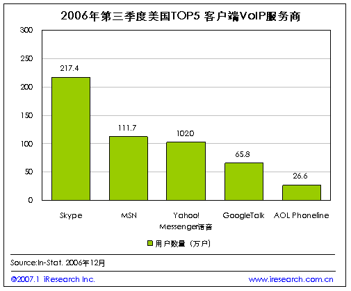 iResearch艾瑞市場咨詢根據(jù)In-Stat的統(tǒng)計數(shù)字整理發(fā)現(xiàn),目前在美國VoIP市場中,以客戶端為服務基礎的服務提供商的用戶數(shù)量來看,占市場主導位置的五大服務商為Skype、MSN、Yahoo、Google和AOL.到2006年第三季度為止,Skype的用戶已經(jīng)達到了217.4萬,排名第五位AOL Phoneline的用戶數(shù)量也有26.6萬之多。