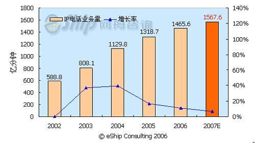 從圖中可以看出,國內(nèi)IP電話市場近年呈現(xiàn)出快速增長趨勢,2002-2007年年均增長率為20.7%。預計2007年IP電話的通話時長將達到1567.6億分鐘,同比增長7%。但從2005年開始,IP電話的增長率呈下降趨勢,這主要是受管制限制和移動長途的替代作用所致。