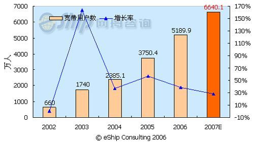 從圖中可以看出,中國的寬帶用戶數(shù)保持了快速的發(fā)展勢頭,從2002-2007年年均增長率為58.7%,至2007年,國內(nèi)的寬帶用戶數(shù)將達到6640.1萬。