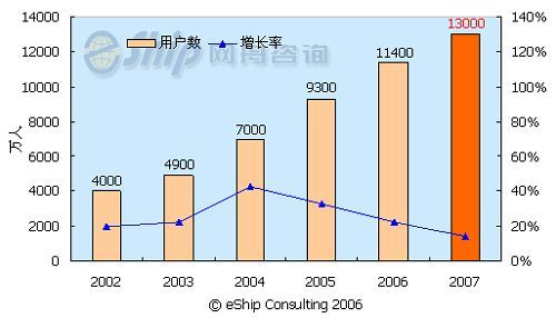 從圖中可以看出,國內(nèi)即時通訊用戶數(shù)保持了較快的發(fā)展速度,從 2002-2006年年均增長率為26.6%,到2007年國內(nèi)即時通訊用戶數(shù)將達到1.3億。
