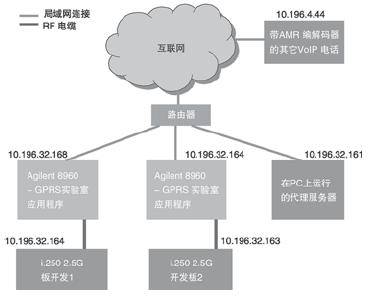 8960 ,將GRPS實驗室應(yīng)用測試集用作媒介,將 i.250 2.5G 開發(fā)板卡 (ADS板卡)連接到互聯(lián)網(wǎng)。ADS板卡在接通電源時,注冊登錄到GPRS網(wǎng)絡(luò),測試集然后通過路由器連接到互聯(lián)網(wǎng)。測試集充當(dāng)連接到GPRS的DUT的橋梁,讓它們接入互聯(lián)網(wǎng)。一旦GPRS上下文激活,測試集將為ADS分配一個固定IP地址。此外,在PC上運(yùn)行的代理服務(wù)器也連接到同一個路由器。通過這種安排,確保三個實體都能在同一網(wǎng)段內(nèi)運(yùn)行。這樣就能對同一個網(wǎng)段內(nèi)的分組流量進(jìn)行監(jiān)控,用于開發(fā)目的。