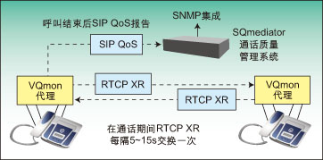 圖2顯示了如何在IP網(wǎng)絡(luò)上使用行業(yè)標(biāo)準(zhǔn)覆蓋質(zhì)量管理系統(tǒng)。圖中顯示了嵌入式軟件探測裝置,如IP話機(jī)中的行業(yè)標(biāo)準(zhǔn)VQMon代理,它們可實(shí)時(shí)監(jiān)測通話質(zhì)量。這些代理可生成RTCP