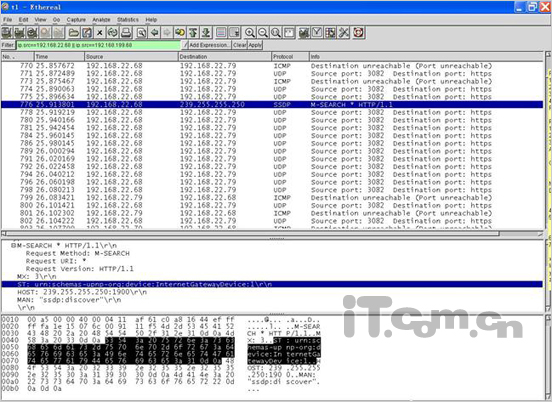 分析結(jié)果:除了可以看到有UPnP協(xié)議,DHCP發(fā)現(xiàn)協(xié)議等網(wǎng)絡(luò)協(xié)議外沒(méi)有發(fā)現(xiàn)任何已知的VoIP協(xié)議且協(xié)議被加密。加密技術(shù)和Skype類(lèi)似,每一次通話使用的端口都不相同。
