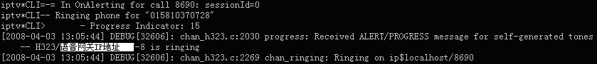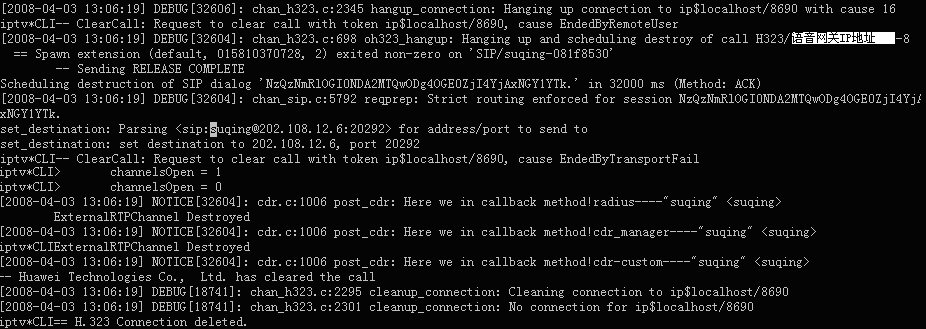 表示軟交換Asterisk與華為8010語(yǔ)音網(wǎng)關(guān)的H323連接在此釋放