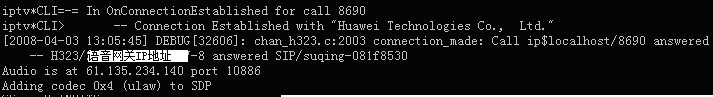 表示軟交換Asterisk與華為8010語(yǔ)音網(wǎng)關(guān)的H323連接已經(jīng)成功建立