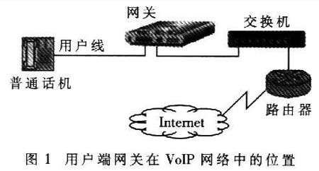 近年來隨著寬帶網(wǎng)絡(luò)和IP技術(shù)的日益發(fā)展,VoIP>(Volee over Internet Protoc01)技術(shù)的應(yīng)用越來越廣泛。網(wǎng)關(guān)是VoIP網(wǎng)絡(luò)中的重要設(shè)備,按照應(yīng)用領(lǐng)域可分為電信級網(wǎng)關(guān)和用戶端網(wǎng)關(guān)。用戶端網(wǎng)關(guān)設(shè)備主要應(yīng)用于小區(qū)和企業(yè),是連接終端電話和IP網(wǎng)絡(luò)的橋梁,主要功能是進行語音編解碼、信令處理、VoIP協(xié)議處理和路由協(xié)議處理等。用戶端網(wǎng)關(guān)設(shè)備在VoIP網(wǎng)絡(luò)中的位置如圖1所示?梢钥闯觯W(wǎng)關(guān)處于用戶電話線路部分的末端、IP網(wǎng)絡(luò)部分的起始端。
