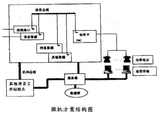 ____這種方案以近幾年發(fā)展迅速的微機語音處理技術為基礎,其基本思想是在微機平臺上 集成各種功能的語音處理卡,完成通信接口、語音處理、傳真處理、坐席轉接等功能,再 結合外部的計算機網絡實現各種應用系統(tǒng)的需求。