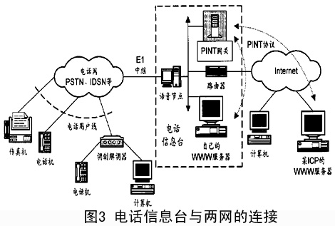 ---- 由 于PINT 業(yè) 務(wù) 主 要 是 以WWW 方 式 實 現(xiàn) 的, 因 此 電 話 信 息 臺 就 應(yīng) 與ICP 合 作, 如 圖3, 在 兩 者 之 間 以 一 種 標(biāo) 準(zhǔn) 的 協(xié) 議 交 換 信 令 和 承 載 數(shù) 據(jù),PINT 協(xié) 議 正 是 一 種 很 合 適 的 協(xié) 議。 為 了 實 現(xiàn) 點(diǎn) 擊 撥 號、 點(diǎn) 擊 發(fā) 送 傳 真 等 業(yè) 務(wù), 需 要 在WWW 服 務(wù) 器 的 頁 面 上 嵌 入 激 活 這 些 業(yè) 務(wù) 的 鏈 接 項, 鏈 接 項 對 應(yīng) 的 后 臺 程 序 是 一 個PINT 客 戶 端 程 序(PINT Client),PINT 網(wǎng) 關(guān) 中 也 具 有PINT Client 的 功 能。PINT Client 包 含 了UAC 和UAS 的 功 能。 在 這 類 業(yè) 務(wù) 的 推 廣 初 期, 由 于PINT 網(wǎng) 關(guān) 較 少, 作 為WWW 服 務(wù) 器 后 臺 程 序 的PINT Client 可 直 接 與PINT 網(wǎng) 關(guān) 交 互。 當(dāng) 業(yè) 務(wù) 使 用 規(guī) 模 進(jìn) 一 步 擴(kuò) 大 后 就 需 要 在Internet 中 設(shè) 置PINT Server, 各PINT Client 借 助 于 這 些PINT Server 來 找 到 一 個 合 適 的PINT 網(wǎng) 關(guān)。 如 果 電 話 信 息 臺 自 身 提 供 了ICP 的 功 能, 那 么 在 信 息 臺 內(nèi) 部 的 局 域 網(wǎng) 上 就 可 以 方 便 地 實 現(xiàn) 業(yè) 務(wù)。