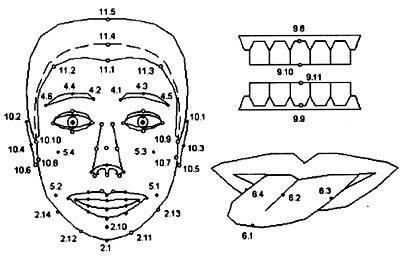現(xiàn)在運行的系統(tǒng)中多為參數控制系統(tǒng),其中控制參數也多采用MPEG-4所定義的人臉動畫參數(facial animation parameter,FAP)。MPEG-4制定了一整套人臉模型化描述方法,包括用于定義人臉模型的面部定義參數(facial define parameters,FDP)和一組用于定義人臉面部動作的人臉動畫參數FAP。其中FDP通過對人臉上84個特征點的位置信息來定義人臉模型,這些點不僅包括外表看得見的人臉特征點,還包括了舌頭、牙齒等口腔內器官的特征點,如圖1所示。
