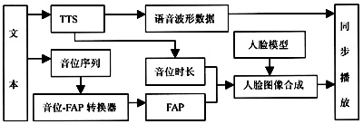 FAP一共有68個參數,包括兩個高級參數和66個低級參數。高級參數是視位(viseme)和表情(expression),視位分為15個,分別表示人們發(fā)某一音位時的面部動作;表情分為高興、悲傷、憤怒、害怕、厭惡、驚奇六種。66個低級參數用來控制部分FDP特征點的運動,進而形成各種復雜的人臉動作。這些標準的制定極大地推動了參數控制合成方法的發(fā)展,使這種方法在人機交互、計算機網絡交談、游戲動畫等方面得到更為廣泛的應用,圖2 是參數控制的TTVS系統(tǒng)的基本框架。