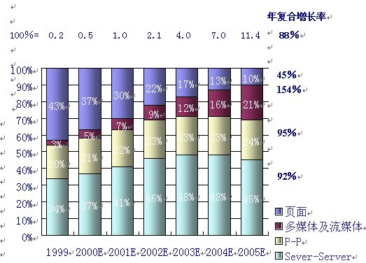 同時,人們對P-P的互動及多媒體的傳輸?shù)男枨髮⒊蔀榫W(wǎng)絡(luò)使用的2個最主要的發(fā)展趨勢。據(jù)麥肯錫公司和JP摩根的分析和預(yù)測,多媒體及流媒體的IP流量將以每年154%的復(fù)合率增長,而P—P的IP流量將以95%的年復(fù)合增長率增長,這2項(xiàng)將成為用戶需求增長最快的業(yè)務(wù)。如下圖,