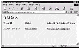 如果在前面已設(shè)置了提醒功能,那么在臨近會議前屏幕上將出現(xiàn)提醒窗口。教師機和學生機有三種方法可以參加會議:點擊提醒窗口中[參加會議]按鈕;或者不等提醒,直接點擊會議邀請函中的鏈接打開會議網(wǎng)頁;最好的方式還是打開IE,輸入網(wǎng)址http://x/conferencing/list.asp進入會議(x為Exchange服務器的IP地址或計算機名),如圖3。