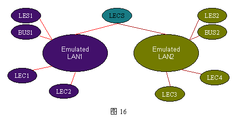 每個(gè)ELAN(Emulated LAN)由一組LANE客戶(hù)(LEC)和LANE服務(wù)構(gòu)成。LEC還可以是作為ATM主機(jī)代理的網(wǎng)橋和路由器。LE服務(wù)由三個(gè)不同的功能實(shí)體構(gòu)成:LAN仿真配置服務(wù)器(LECS)、LAN服務(wù)器(LES)和BUS,這三個(gè)服務(wù)實(shí)體可以各自存在,但通常位于同一設(shè)備,例如:LES可以位于ATM交換機(jī)、路由器、網(wǎng)橋和工作站。ATM LANE的構(gòu)成及相互關(guān)系如下圖16所示: