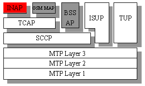 智能網(wǎng)的通信采用SS7信令,SS7信令系統(tǒng)中的智能網(wǎng)應(yīng)用部分(INAP)是專(zhuān)門(mén)用于智能網(wǎng)通信的。INAP是建立在TCAP和SCCP協(xié)議層之上的,在下面SS7協(xié)議棧中可以看出INAP在SS7協(xié)議棧中所處的位置: