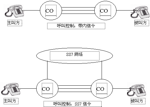在任一個電話系統(tǒng)中,都要規(guī)定一些固定的信令機制來實現(xiàn)呼叫的建立和釋放。最初,象POTS(普通舊電話業(yè)務)那樣的電話系統(tǒng)都是用帶內(nèi)信令來傳遞信息。帶內(nèi)信令是指信號的頻率在話音頻率范圍之內(nèi)(0.3~3.4kHz),比如:DTMF信號就屬于帶內(nèi)信號。帶內(nèi)信號是在話音通道內(nèi)傳遞的。相反,SS7使用一個完全獨立于話音網(wǎng)的數(shù)據(jù)網(wǎng)來傳遞信令,這樣可以大大提高電話網(wǎng)絡的利用率。比如,在呼叫發(fā)起但未建立完成之前,不需要分配話音電路,這使得傳遞的信令數(shù)據(jù)只和呼叫有關(guān)而和電路無關(guān),為在交換機之間、交換機和其它網(wǎng)絡之間高效、可靠地傳遞信息提供了可能。同時也支持更高級的應用,如:主叫識別、無線漫游和800號業(yè)務。如下圖1,顯示出了帶內(nèi)信令和SS7在呼叫接續(xù)上的區(qū)別。