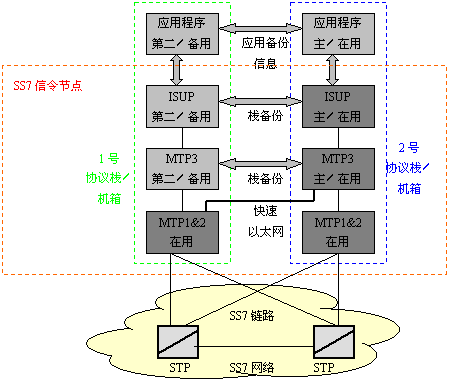 只有SS7鏈路出現(xiàn)故障時,SS7協(xié)議才有相應的規(guī)則去處理故障,對其它故障的處理必須在設(shè)計SS7平臺和整個系統(tǒng)結(jié)構(gòu)時予以考慮。還有一個普遍的要求是:軟件的升級過程中不能影響整個系統(tǒng)的運行。能達到以上要求的一個解決方案是:使用兩個主機箱,在每個主機箱里插有SS7接口板,用于支持一條或多條SS7鏈路。讓兩個主機都使用一個SS7地址,也就是共用一個信令點編碼,這樣遠端的交換機或STP就會認為這兩個主機是一個完整的系統(tǒng)。這樣,這兩個主機組成的系統(tǒng)就能在其中一個出現(xiàn)故障時仍能正常工作。