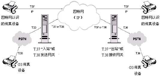 在T.37術(shù)語(yǔ)中,因特網(wǎng)傳真(Ifax)設(shè)備能夠通過一個(gè)出站設(shè)備向傳統(tǒng)連接到PSTN的傳真機(jī)發(fā)傳真,或者通過一個(gè)IP網(wǎng)直接發(fā)送到另一個(gè)因特網(wǎng)傳真(Ifax)設(shè)備。