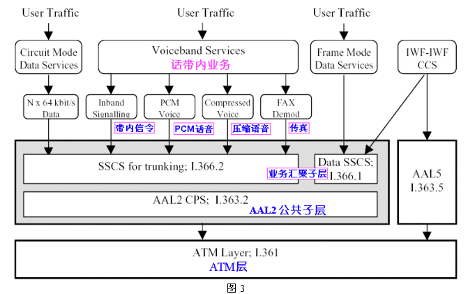 下圖3給出了VoATM的協(xié)議結(jié)構(gòu)模型(來源:AF-VMOA-0145-000:ATM論壇ATM Forum)。這是一個(gè)基于AAL2進(jìn)行話帶話音及多媒體業(yè)務(wù)傳送的協(xié)議框架。在ATM論壇標(biāo)準(zhǔn)中,被稱為環(huán)路仿真業(yè)務(wù)(LES:Loop Emulation Service),和傳統(tǒng)PSTN不同的是采用很大新技術(shù)以充分利用傳送帶寬: