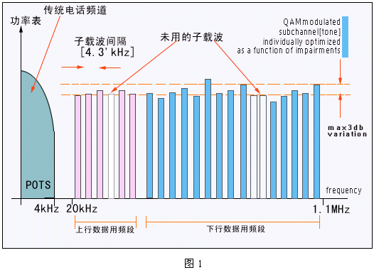 DSL技術(shù)是在人們對高速互聯(lián)網(wǎng)訪問需求推動(dòng)下的產(chǎn)物。DSL利用頻率復(fù)用和OFDM調(diào)制技術(shù),在不影響傳統(tǒng)電話業(yè)務(wù)的前提下可以為用戶提供最高達(dá)8Mbps的數(shù)據(jù)傳輸速率。這個(gè)速率是基于POTS的Modem速率(以目前的最高速率56kbps為參考)的140倍;DSL技術(shù)所帶來的巨大帶寬為家庭和小型公司提供了一個(gè)寬帶數(shù)字業(yè)務(wù)的新平臺。這個(gè)DSL平臺可以支持多種寬帶業(yè)務(wù):包括高速Internet接入、虛擬專網(wǎng)及VOD等流媒體業(yè)務(wù)。其基本原理如下圖1所示: