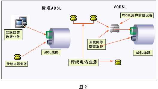 VoDSL技術(shù),就是利用xDSL技術(shù)在一對傳統(tǒng)電話用戶線上,維持原有電話業(yè)務(wù)的同時(shí),提供高速數(shù)據(jù)業(yè)務(wù)(如互聯(lián)網(wǎng)業(yè)務(wù))和多個(gè)額外電話業(yè)務(wù)。利用VoDSL技術(shù),業(yè)務(wù)提供商在無需增添新的數(shù)據(jù)網(wǎng)絡(luò)或硬件線路就可以為用戶提供高速的數(shù)據(jù)接入和更多的電話線路數(shù)及其他增值業(yè)務(wù),從而減少運(yùn)營成本,擴(kuò)大了利潤空間。下圖2的左邊給出了電話運(yùn)營商采用ADSL技術(shù)的基本配置,右邊則給出了VoDSL應(yīng)用。