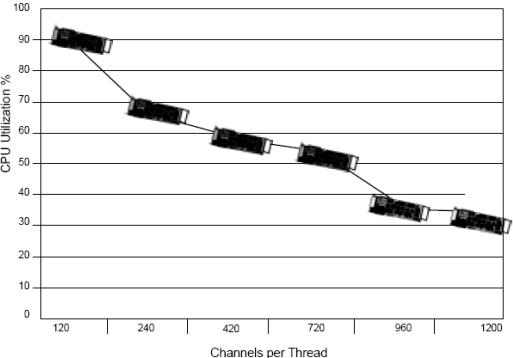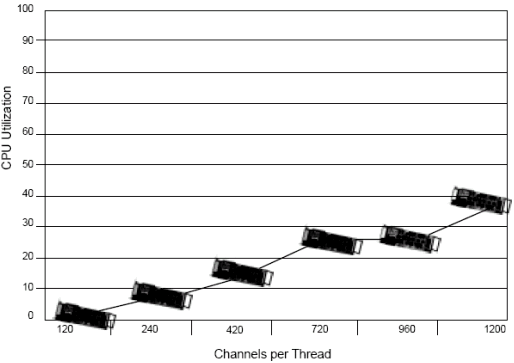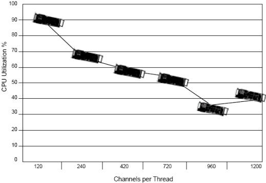 基于1200通道, Dialogic工程師測試了每個線程不同的通道數(shù)(例如每個線程120端口和240端口). 測試結(jié)果表明,