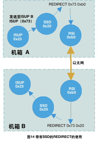 運行在信令卡上的協(xié)議模塊,接收端(對方)的REDIRECT語句應(yīng)該通過ssd或ssds驅(qū)動(通常情況下module_id為0x20)來對訊息進行重定向,如圖14所示。