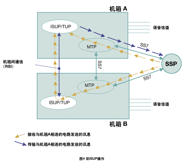 一個雙ISUP/TUP系統(tǒng)通過激活每個機箱中的一半電路協(xié)議狀態(tài)機進行工作。每個ISUP/TUP層通過本地MTP3發(fā)送所有的傳送流量。本地MTP3采用與相鄰SS7節(jié)點之間的本地鏈路進行傳輸,如果該鏈路發(fā)生故障,則采用機箱之間的SS7鏈路。