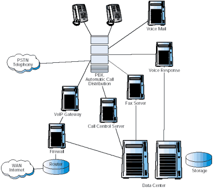 圖1描述了當前一個典型的復雜的企業(yè)通信系統(tǒng)配置。連接到PSTN的主要部分PBX/KTS,仍然是系統(tǒng)的核心,提供了交換和自動呼叫分配的功能。一系列增加的應用通過附屬服務器連接到PBX/KTS上。很多附屬服務器也連到數(shù)據(jù)中心上,因為它們需要訪問企業(yè)的數(shù)據(jù)。 使現(xiàn)有情況變得更為復雜的是,Internet正在變?yōu)椴豢扇鄙俚纳虅展ぞ,各公司紛紛安裝VoIP以降低網絡成本,滿足多媒體通信的需要。這些服務由企業(yè)防火墻后的網關提供,這個網關也是連接到PBX/KTS上的。