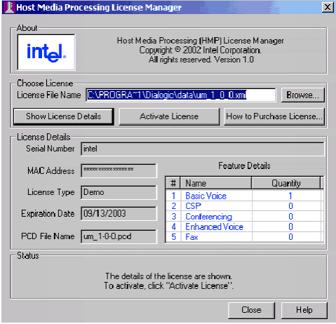 2. 如果HMP許可證管理器GUI沒有在屏幕上,可通過開始 > 程序> Dialogic HMP 1.0