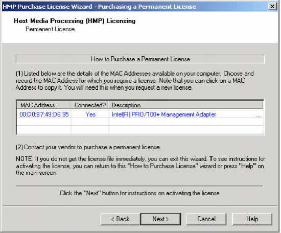 5. 聯(lián)系你的廠家購買一個(gè)永久許可證。你必須提供從在4步中得到的MAC地址?色@得的許可證列表參見表3""HMP